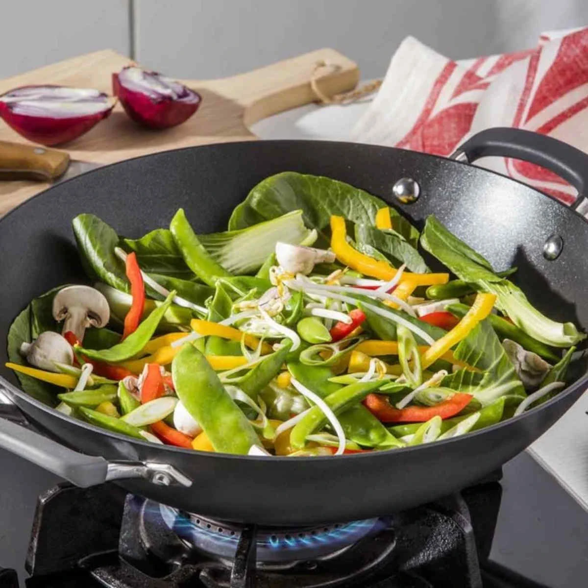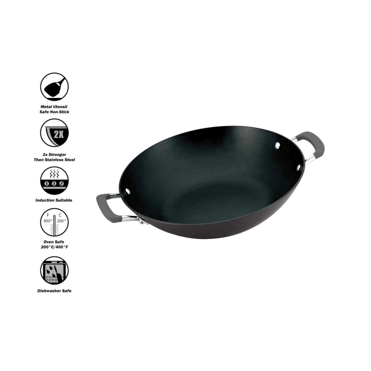 The Anolon Endurance+ Non Stick Wok offers unmatched durability and performance in your kitchen. Anolon’s Gourmet Authority cookware is top of the line, and this 36cm wok is no exception. Two helper handles make this wok easy to maneuver, and its non-stick surface allows for optimal stir-fry results. Enjoy the taste of a perfect stir-fry every time.