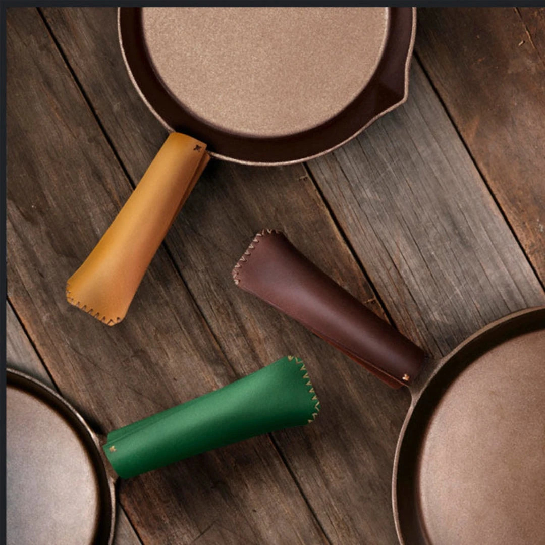 The Ironclad Pan Snug is a handmade leather sleeve that fits snug over all Ironclad Pan handles.