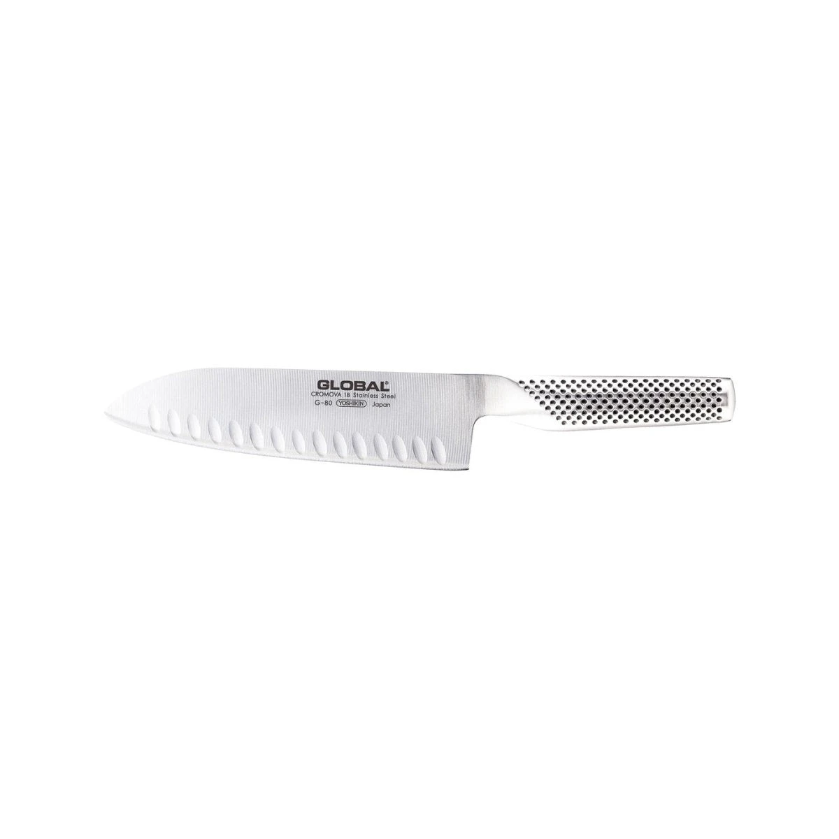 The Global Classic Fluted Santoku Knife 18cm is constructed using advanced CROMOVA 18 stainless steel with ice tempering and hardening process which generates the superior elasticity of the blade that ensures maximum sharpness for longer periods of time