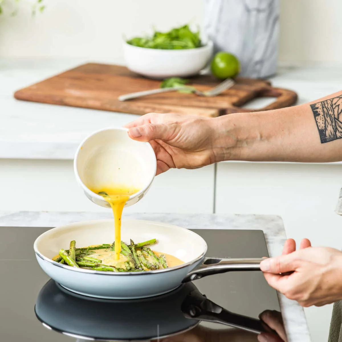 This pan is coated with GreenPan’s advanced Thermolon™ ceramic nonstick coating, which is fortified with diamonds to enhance durability and heat responsiveness. This coating is entirely free from harmful substances like PFAS, PFOA, lead, and cadmium.