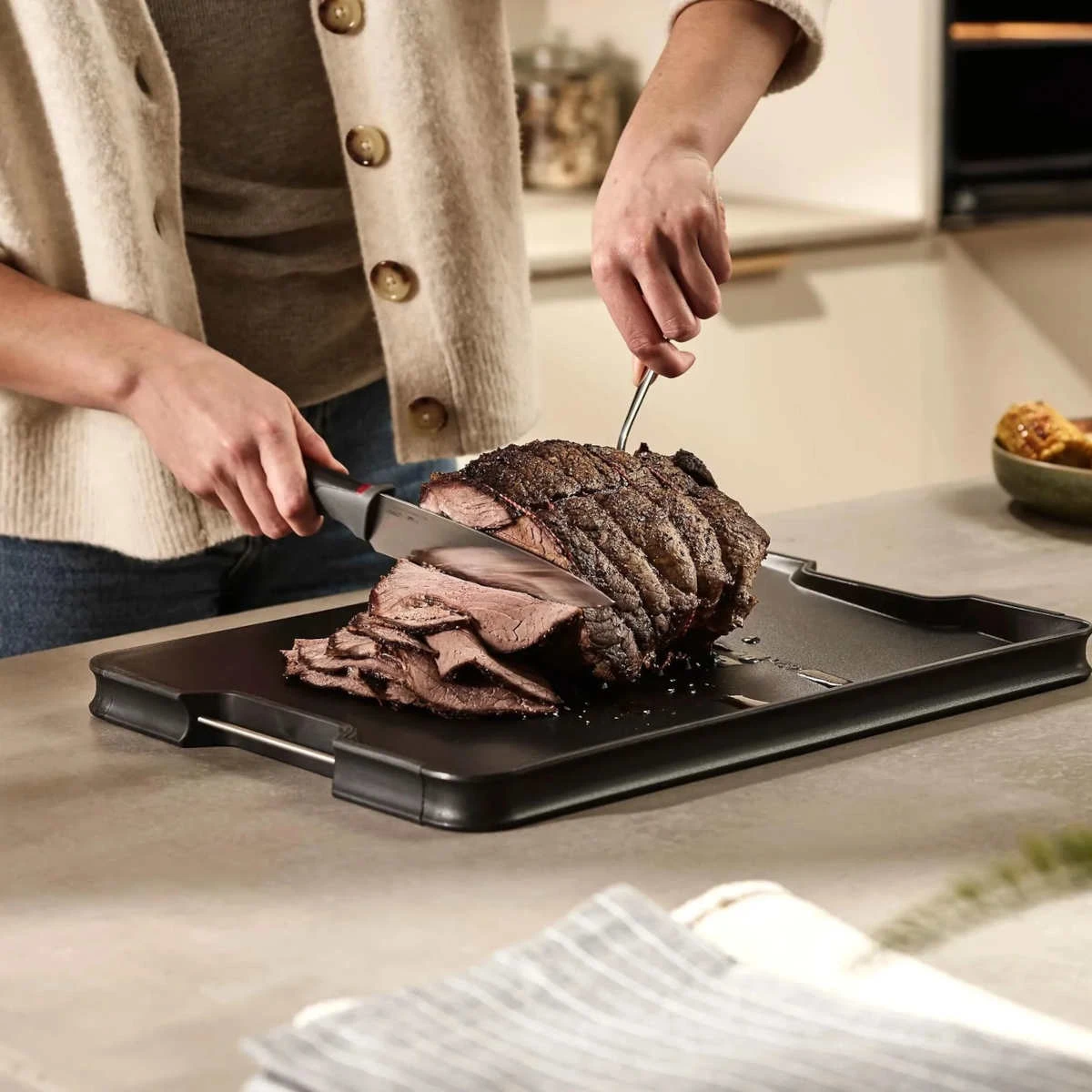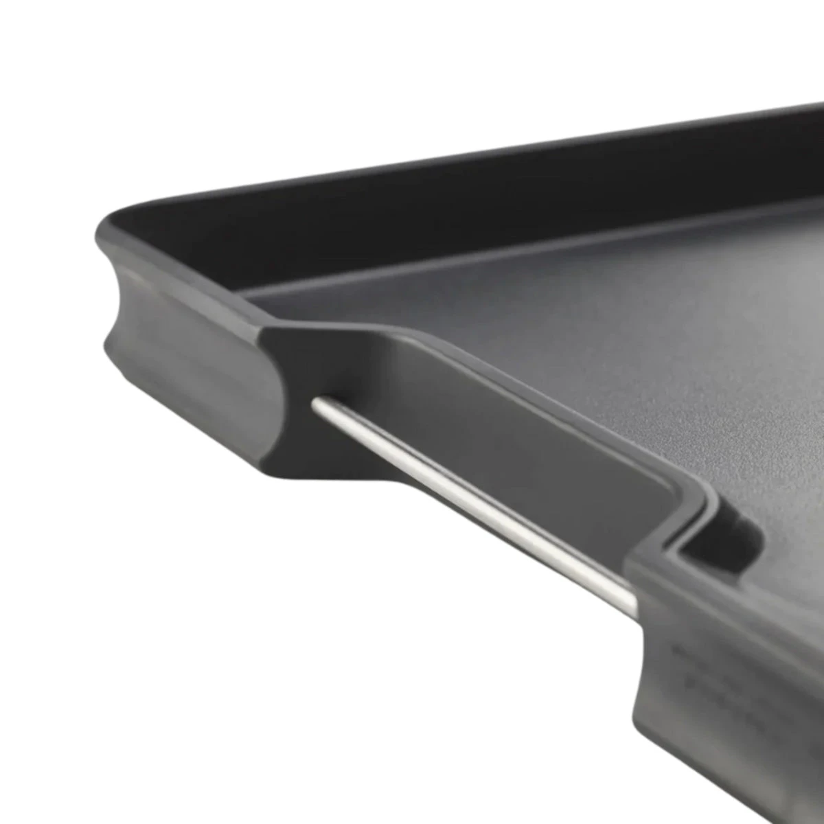 - Unique sloping base and raised edges help catch crumbs and meat juices