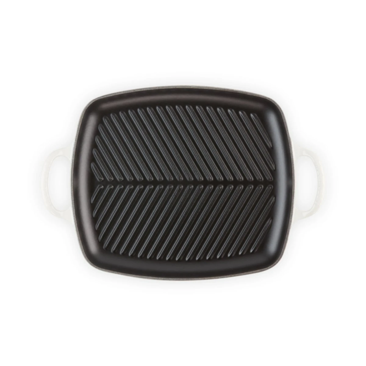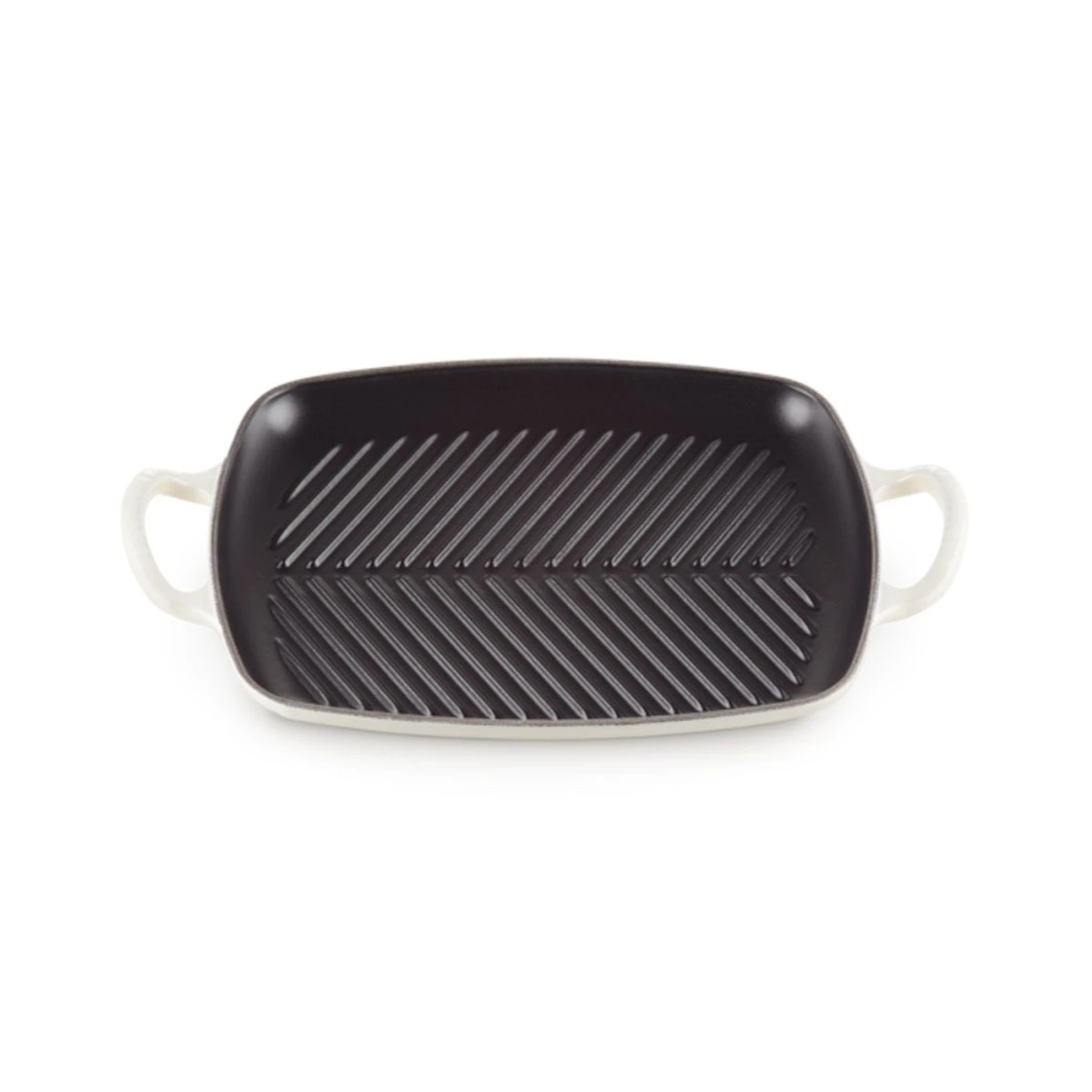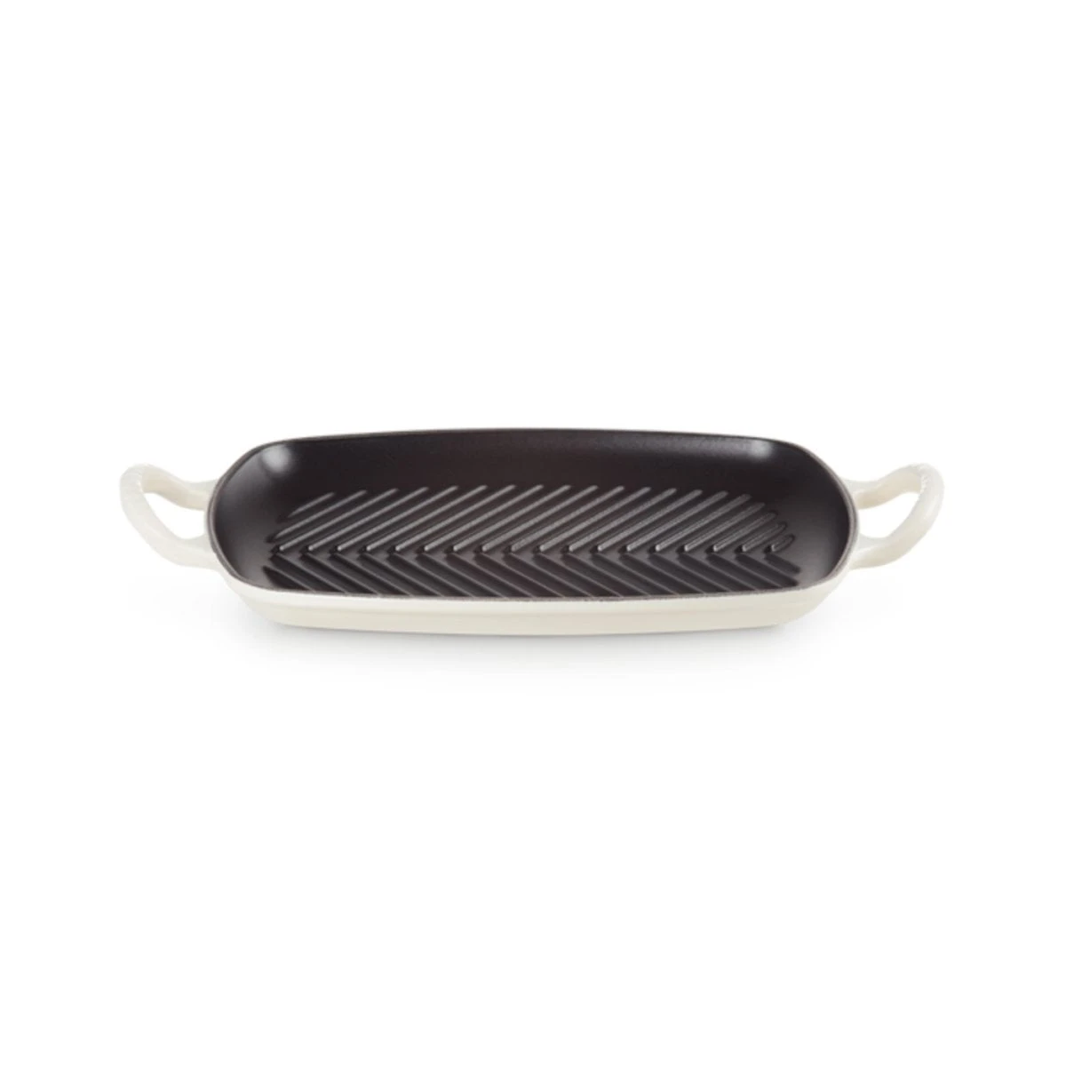 Sear, char, and grill your favorite meats, fish, vegetables, fruits, and breads with the Le Creuset Signature Rectangle Grill in Meringue. This grill is ideal for quick and healthy cooking with little to no oil needed. The ribbed base produces distinct char lines on grilled foods while allowing juices and oils to drain for healthier results.