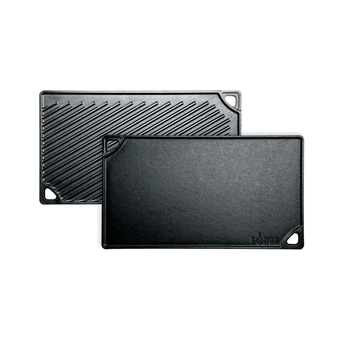 This heavy-duty, pre-seasoned cookware is well-suited for stovetop searing, oven roasting, or browning over an open flame. The flat side is appropriate for preparing grilled cheese sandwiches, omelettes, and pancakes, while the ridged side is optimized for grilling steaks, fish, chicken, and hamburgers.