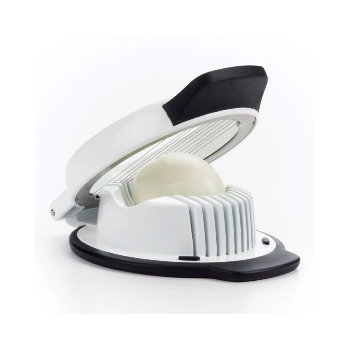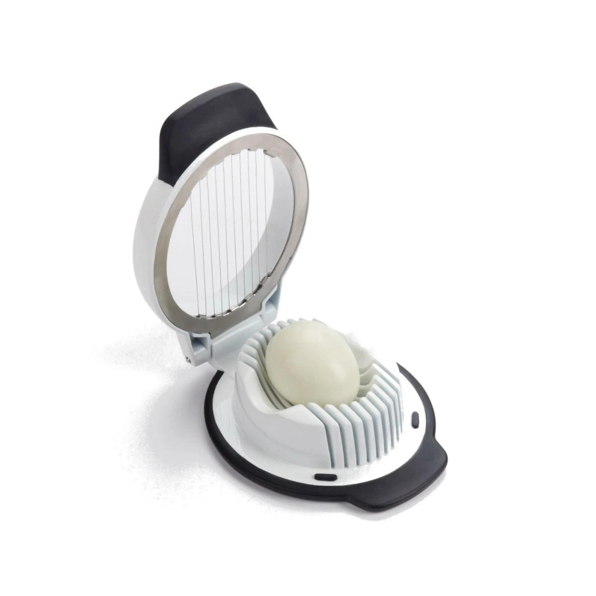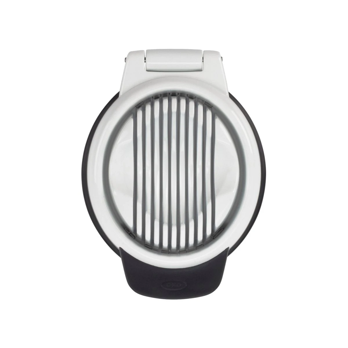 Quickly and easily slice hard-boiled eggs. The OXO Good Grips Egg Slicer yields perfect 5 mm slices with one simple press. The holder cradles the egg in two directions, giving you the option of round or oblong slices. The raised handle is easy to open and close, and the non-slip base provides a comfortable grip while slicing over bowls or plates.