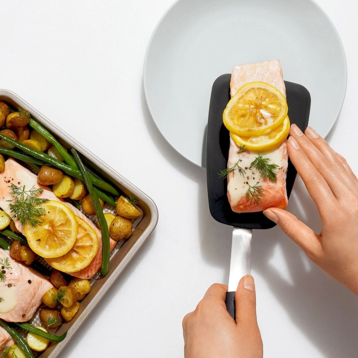 The flexible metal core is encased in heat-resistant silicone for use in hot pans and sheet pans straight out of the oven. The turner’s head has beveled edges that slip under food for lifting and hug the sides of pans for fast deglazing. It’s also large enough to transport chicken or fish filets and sturdy enough to break up ground meat — all without scratching non-stick cookware. Dishwasher safe.