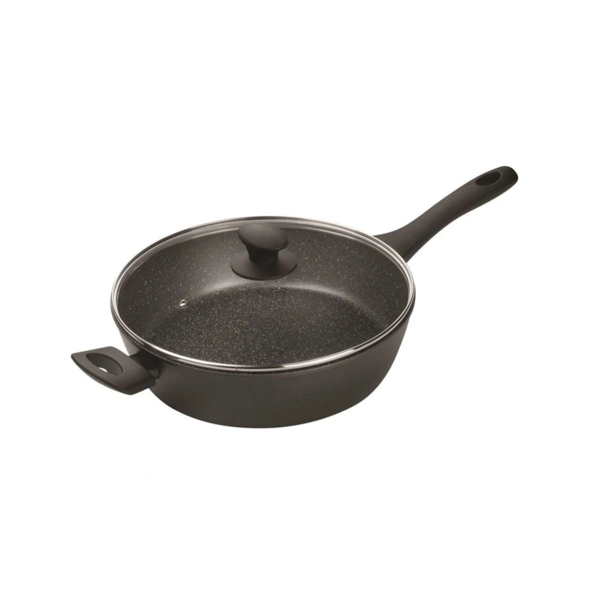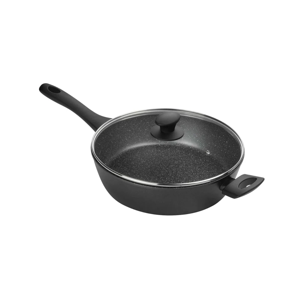 Enjoy healthier meals with less oil and easier clean-up with the Pyrolux Pyrostone Saute Pan. Crafted from forged aluminium with a stone line finish, this non-stick, PFOA-free pan features a temperature-resistant handle and easy-view glass lid for monitoring food as it cooks. Suitable for all cooktops, including induction, and oven-safe to 180°C.