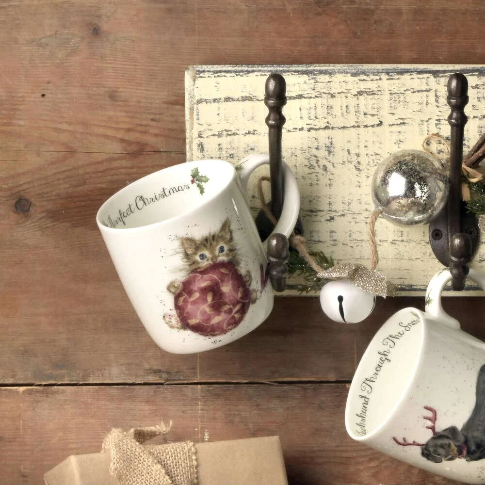 Treat a loved one this festive season with this endearing Fine Bone China Christmas Mug. An adorable kitten, caught in the act of playfully interacting with a Christmas bauble, graces the front of this mug, with the delightful message “Purrfect Christmas” nestled inside.