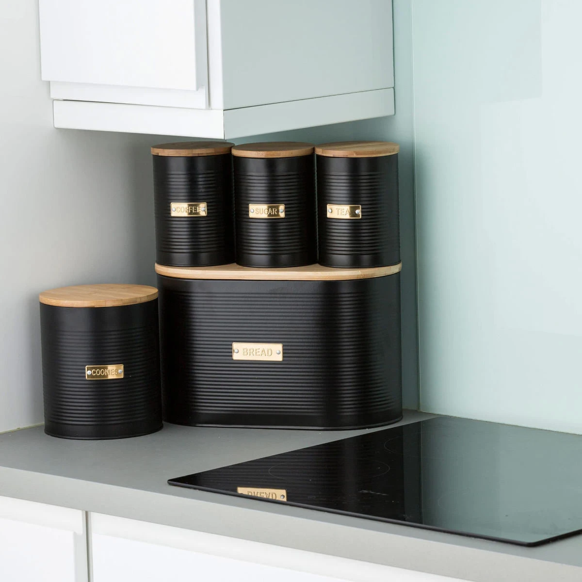 - Attractive ribbed exterior in matte black and gold-coloured label make the canister a stylish yet functional accent on your countertop