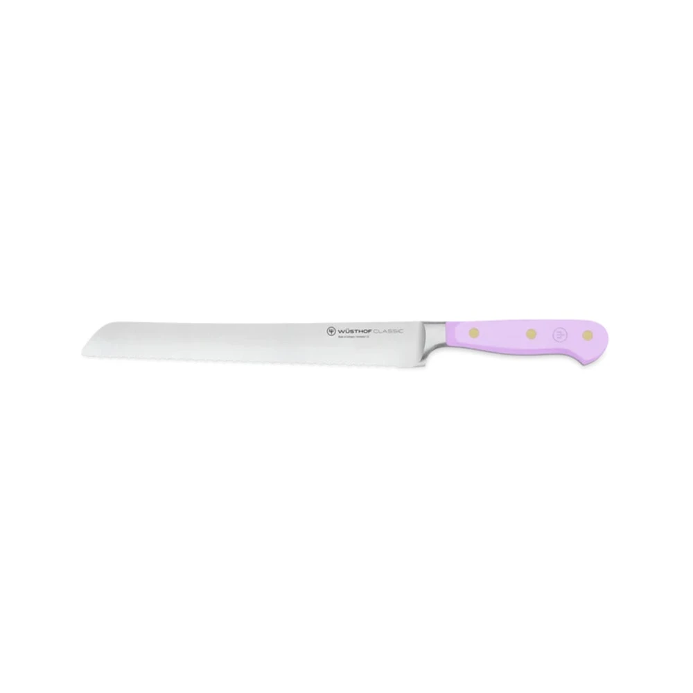 With its special serrated edge and one of five distinctive handle colours, our eye-catching Wusthof Classic Colour Purple Yam 23 cm Double-serrated Bread Knife has an instinct for excellence that’s just right for everyone. As well as slicing effortlessly through crusty loaves of bread or freshly baked rolls and cakes, this bread knife is also perfect for portioning large fruits, hard-skinned vegetables, or Sunday roasts. The double-serrated edge (serrations within serrations) helps the blade remain sharp for longer and requires minimal pressure for clean, even cuts. Enhanced by whichever of the five beautiful new handle colour options you choose, this knife adds an extra dose of self-expression (and style!) to the bread board at your next dinner party or by your side in your kitchen.