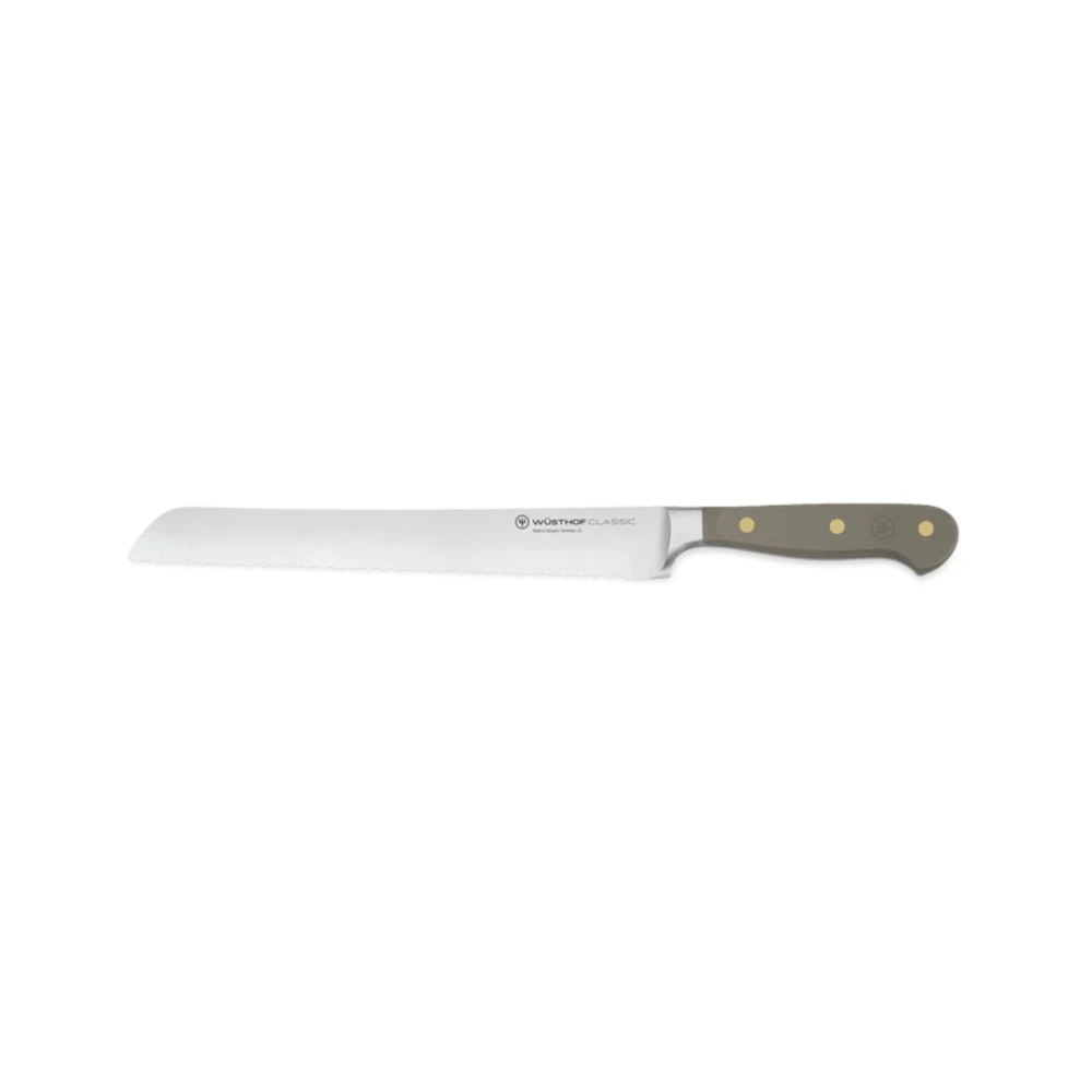 With its special serrated edge and one of five distinctive handle colours, our eye-catching Wusthof Classic Colour Colour Velvet Oyster 23 cm Double-serrated Bread Knife has an instinct for excellence that’s just right for everyone. As well as slicing effortlessly through crusty loaves of bread or freshly baked rolls and cakes, this bread knife is also perfect for portioning large fruits, hard-skinned vegetables, or Sunday roasts. The double-serrated edge (serrations within serrations) helps the blade remain sharp for longer and requires minimal pressure for clean, even cuts. Enhanced by whichever of the five beautiful new handle colour options you choose, this knife adds an extra dose of self-expression (and style!) to the bread board at your next dinner party or by your side in your kitchen.